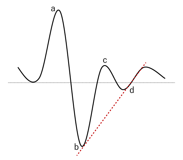 上図は標準的な若い人のAPG波形で、a波に対してb波は深く、d波は浅い波形です。